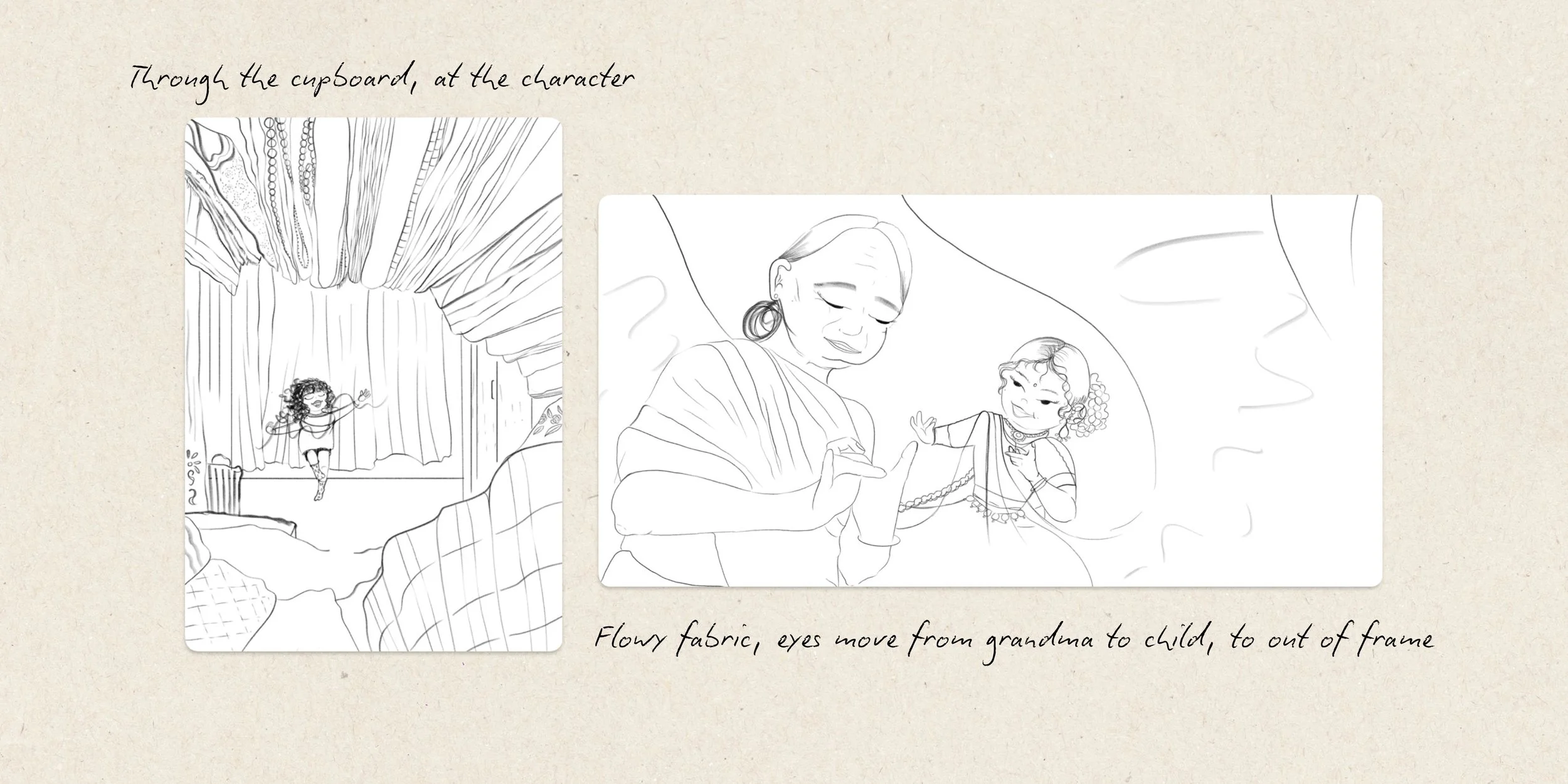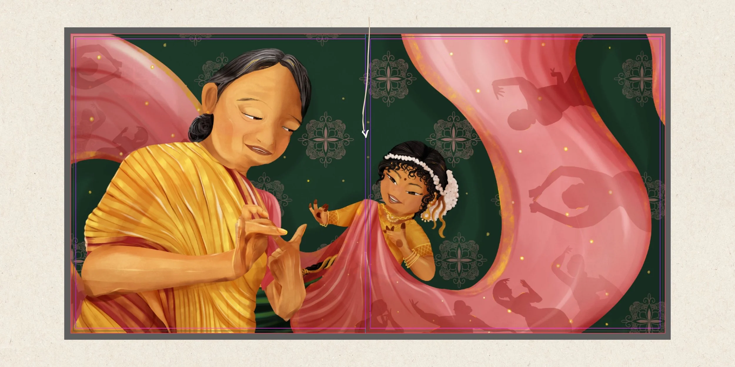 My plan was to lead the reader’s eye through the sweeping movement of the fabric. I was thinking about flow, background, and how to carry over details from my thumbnails. But the gutter? It ended up running right through the child’s shoulder, with her face sitting uncomfortably close. Depending on the book’s binding, that could warp the art in ways I didn’t intend.